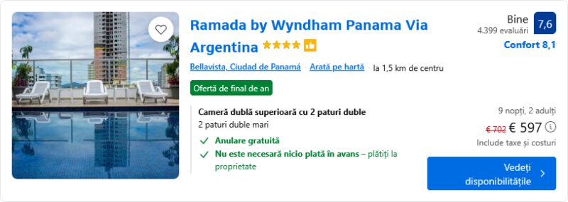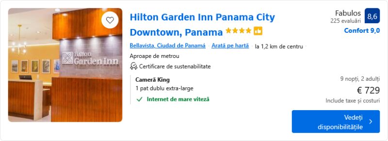 1052 €/pers. (zbor si cazare Hilton Garden Inn Panama City )