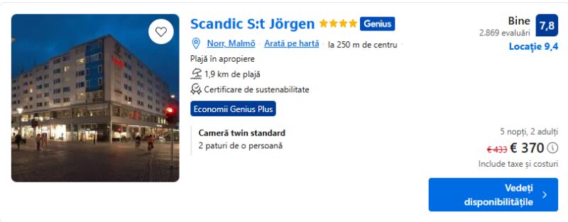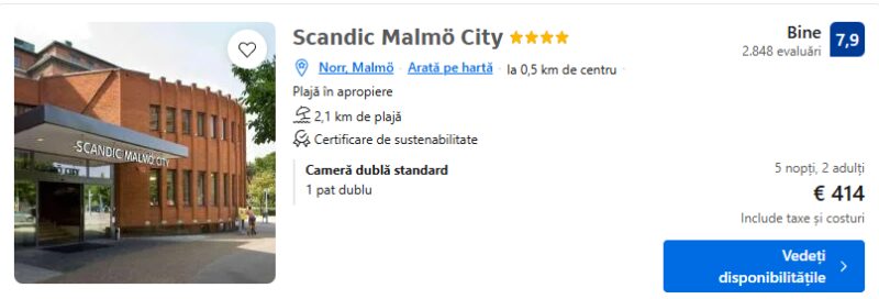397 €/pers. (zbor si cazare Scandic Malmö City )
