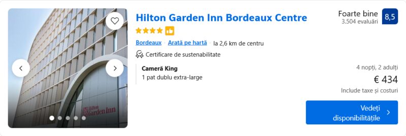 269 €/pers. (zbor si cazare Hilton Garden Inn Bordeaux Centre )