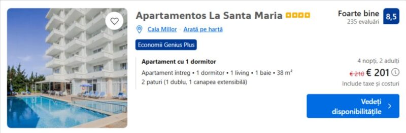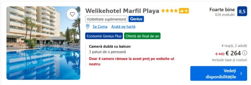 Uite o idee care mi-a atras atentia: pentru aproximativ 190 euro, poti sa ai deja incluse zbor dus-intors si cazare. E genul de oferta DIY unde rezervi separat, dar ai control total asupra vacantei tale.