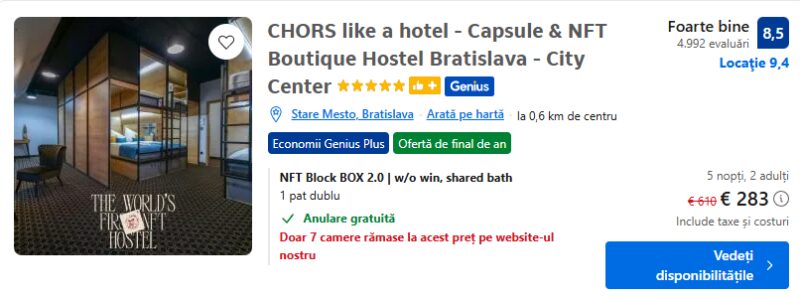 182 €/pers. (zbor si cazare CHORS like a hotel – Capsule & NFT Boutique Hostel Bratislava – City Center )
