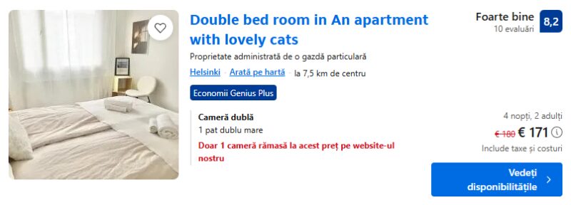 200 €/pers. (zbor si cazare Double bed room in An apartment with lovely cats )