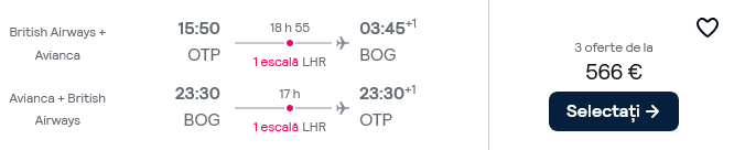 Vrei sa vezi Columbia pe bune? Acum ai zboruri spre Bogota cu British Airways de la doar 566€ dus-intors. Zbor cu o companie buna si confort pe tot drumul.